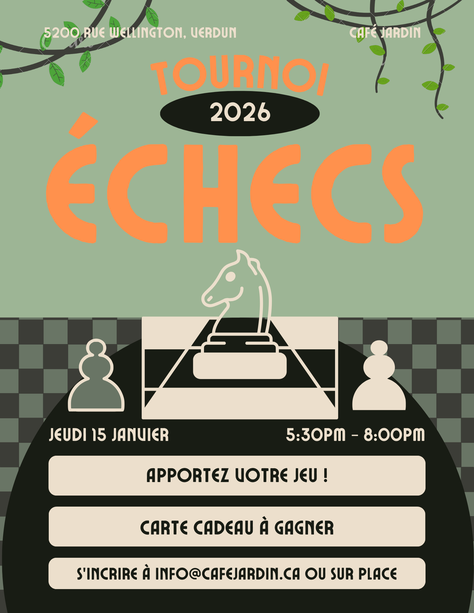 Dans le cadre des "Jeudi jeux", le Café Jardin organise un 4e tournoi d'échecs amical!